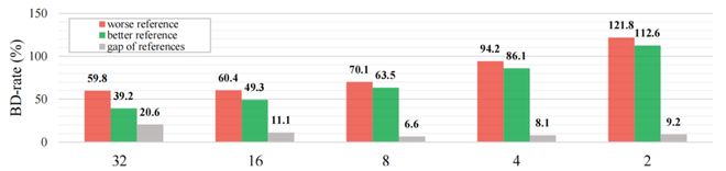 用参考左右两帧的双向模型作为基准,用 BD-rate 表示相同质量下测试算法码率相对基准码率的增加比例(越小越好)。上图横坐标表示帧跨度,红色柱体表示只输入两个参考帧中较差的帧,绿色柱体表示只输入两个参考帧中较好的帧,灰色表示两者的 BD-rate 差值。从图中可以看到,在帧跨度较大(即 32 和 16)时,不平衡的参考贡献问题非常严重,这将极大影响后续帧的编码效率。