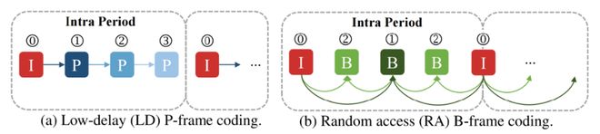 视频编码中的低时延模式(Low Delay, LD)采用单向 P 帧编码,仅参考前一帧进行前向预测编码。该方法延迟较小,更适用于直播场景,可以满足实时交互需求,但压缩效率偏低。双向模式(Random Access, RA)采用双向分层 B 帧编码,每个 B 帧可同时参考前后两帧,利用时域上的双向信息,在相同画质下可比低延迟模式节省 20+% 码率,是点播、存储等高画质场景首选。