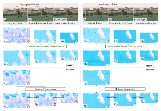 BMC 的可视化效果如上图所示,图左半部分表示长跨度的参考,右半部分表示短跨度的参考,上半部分表示所提 BRHVC 用到的 BMC 模块,下半部分表示基准 Baseline 模型。可以看到,BMC 对多尺度光流进行单独生成和整体压缩,可以有效避免大跨度下光流生成时遇到的光流杂乱错误的情况。