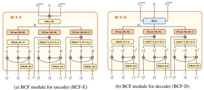 BCF 模块则针对不平衡参考贡献问题,在编码端通过计算当前帧与双向运动补偿结果在像素域的相似度差异,生成空间自适应权重图与偏置项,将参考特征在通道维度按重要性重新加权融合;解码端则利用熵解码后的潜变量重建权重信息,实现与编码端协同。
